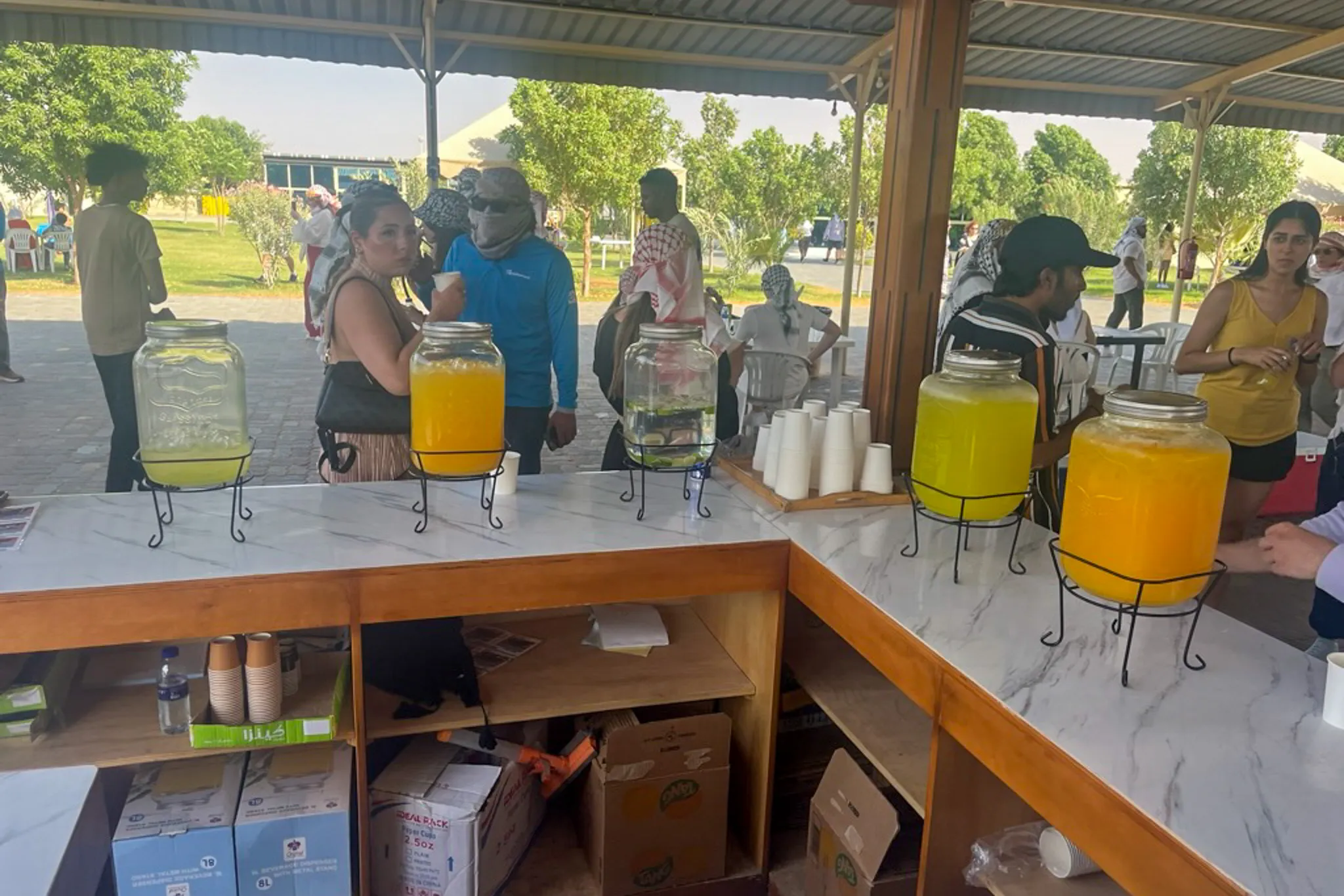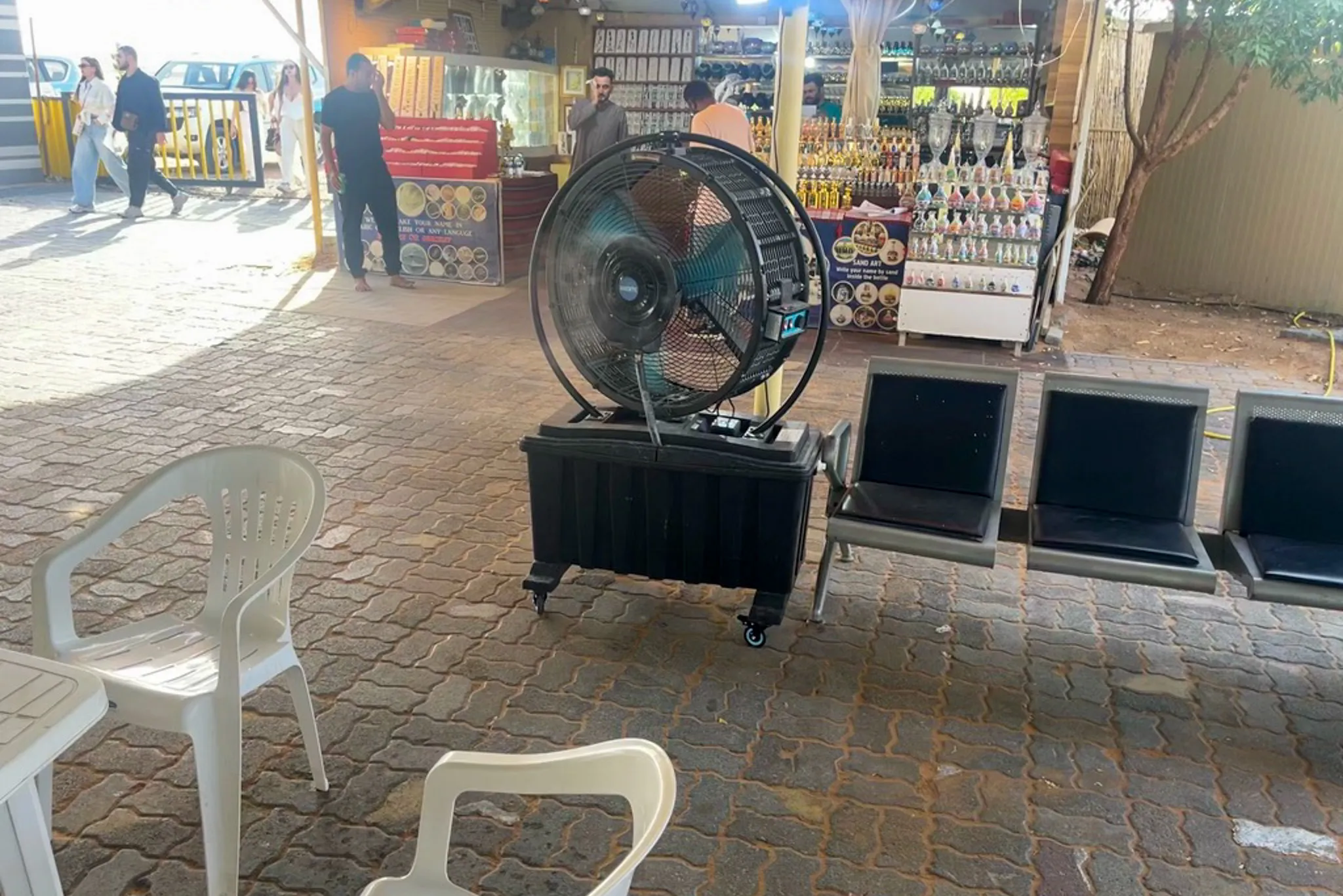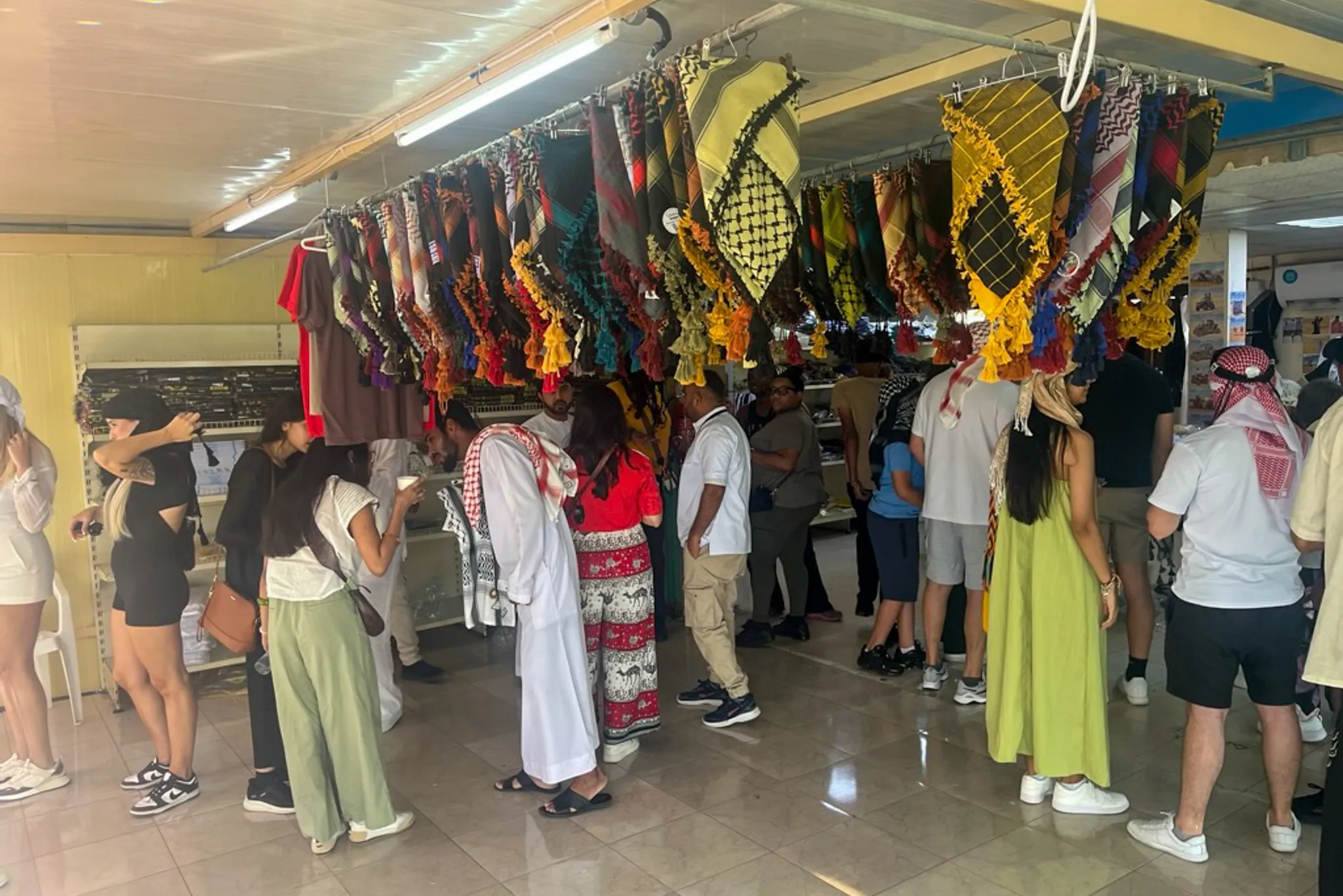 - an air-conditioned indoor area with traditional scarves and clothing for sale,