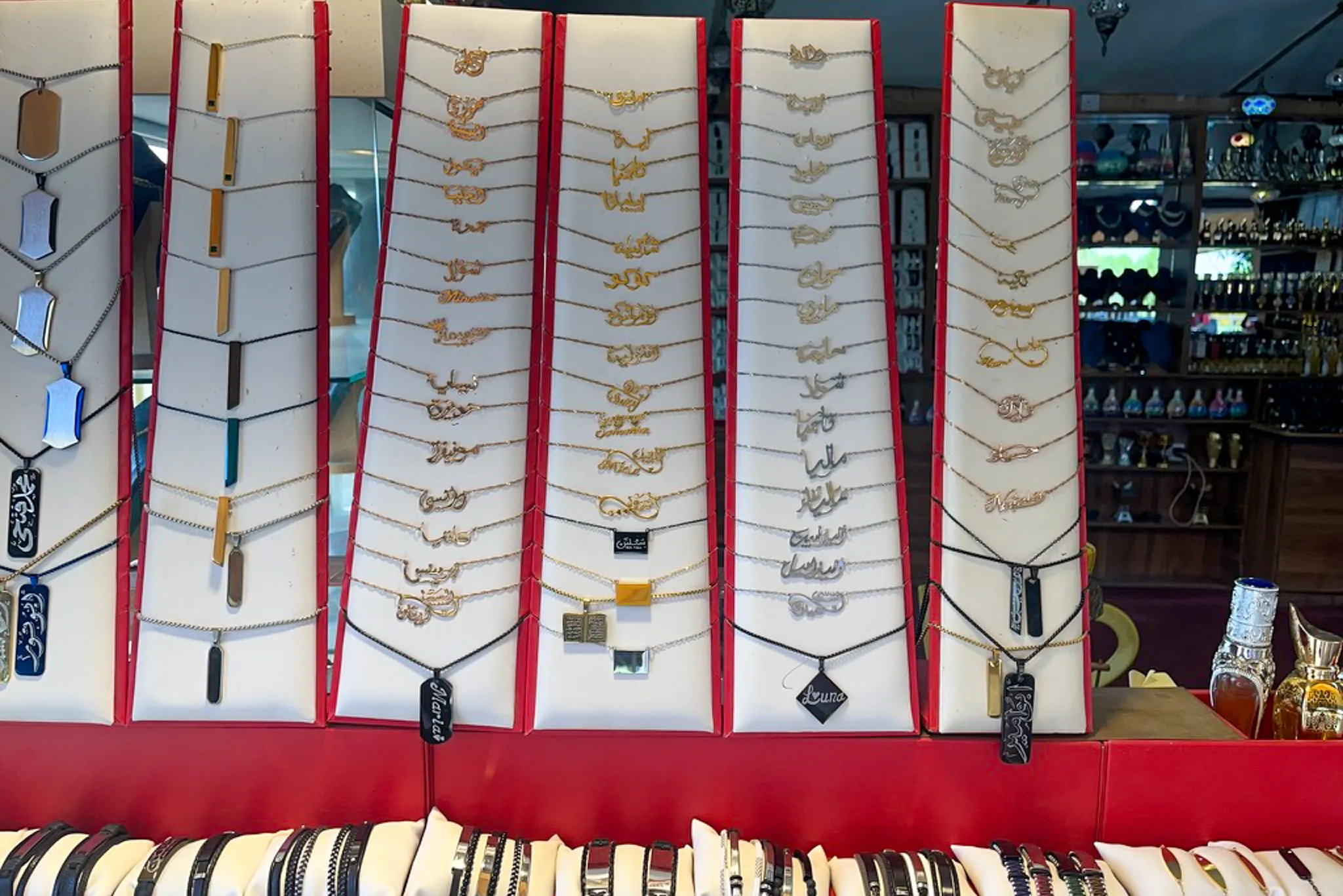 Personalized name jewelry is a popular souvenir. If someone approaches you with a pen/pencil, it’s likely they’ll ask for your name (or your loved one’s). This service is free, but if you choose to buy a piece, it’s usually priced around 40 AED(about 10 EUR). I even bought one as a surprise for my fiancée! Spoiler alert the Quality is questionable. - Perfumes 🧴: